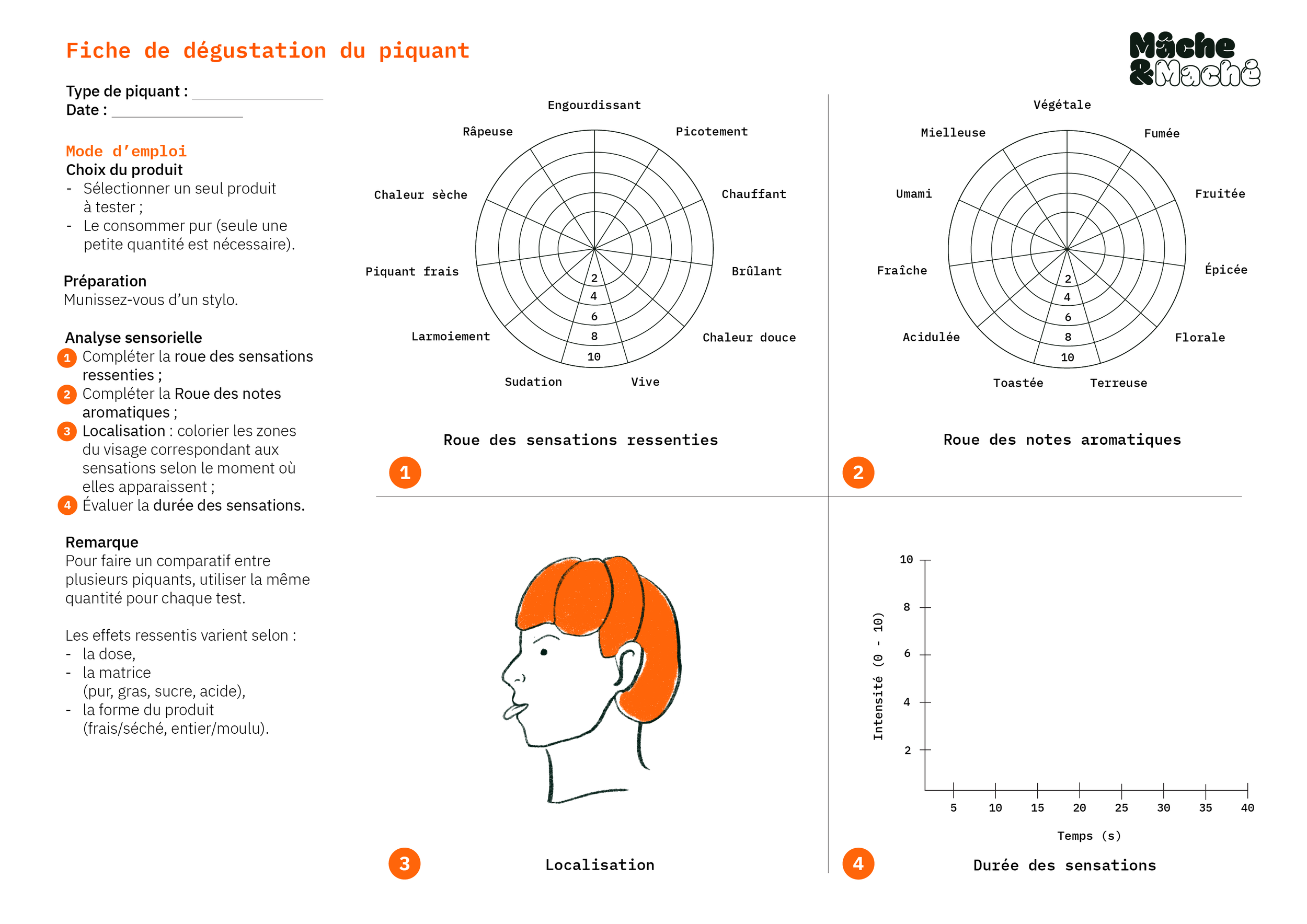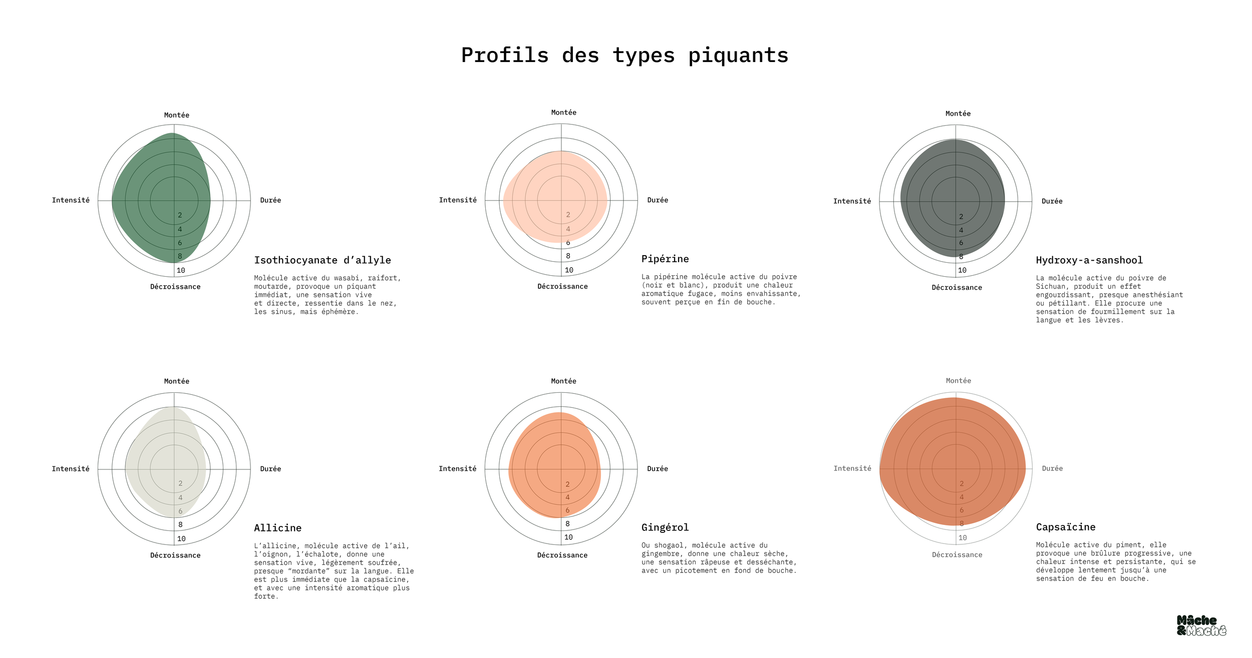 Plutôt qu’un classement par « force », cet outil caractérise les piquants selon différents axes : l’effet produit au moment de la consommation, sa localisation, ses notes aromatiques, et sa durée.